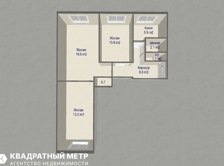 - Planning: Windows face both sides of the house. The total area is 59.1 sq m. Separate bathroom, 3 living rooms